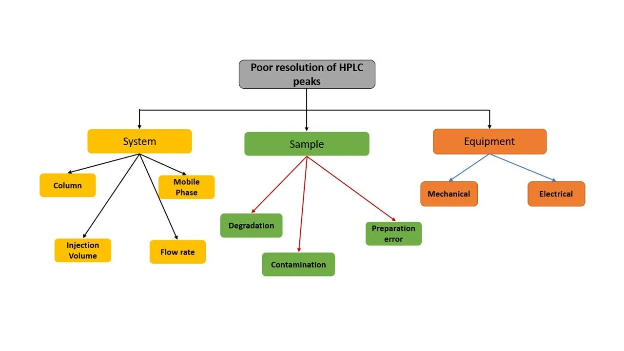 Example of a Fault tree analysis: Potential problems with new method: Poor resolution of HPLC peaks.